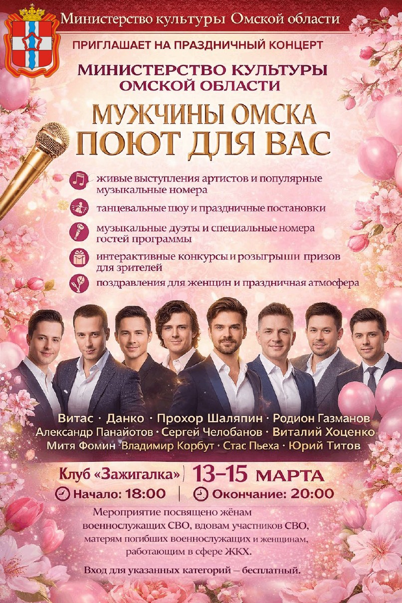 Министерство культуры Омской области приглашает на праздничную концертную программу, которая пройдет 13–15 марта в клубе «Зажигалка». Гостей ждут живы